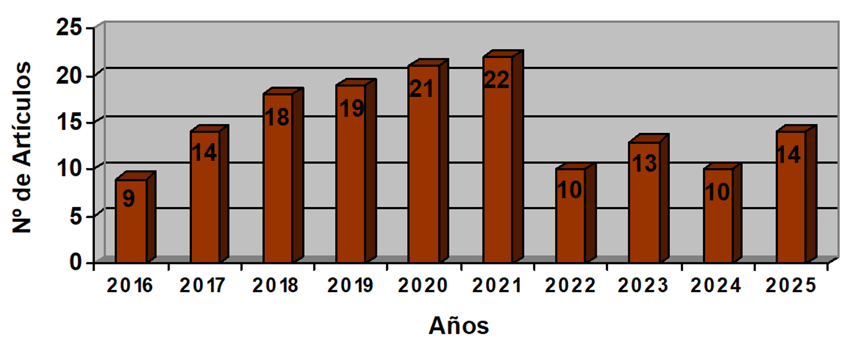 Atendiendo al número total de artículos, la media es de 7,8 trabajos/número. En cifras anuales, 2016 es el año en el que menos documentos se editaron (9), mientras que 2020 (21) y 2021 (22) son los que arrojan las cifras más altas. No obstante, referido a 2020 debemos señalar que a los dos volúmenes propios del año, se sumó el ya referido número extra (Figura 1).