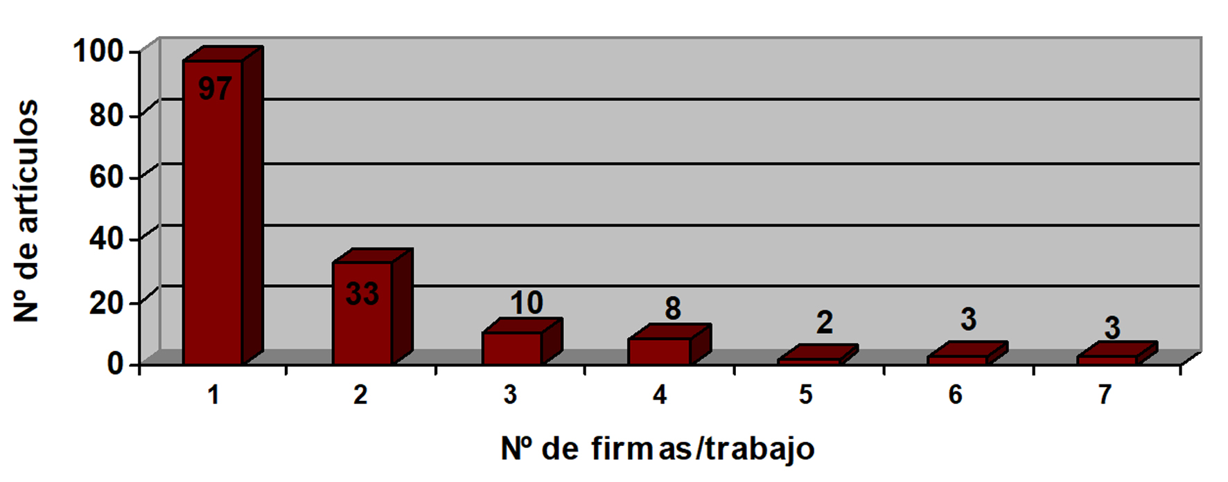Los 156 documentos editados han sido firmados por un grupo de 138 autores, lo que arroja una media de 1,13 firmas/documento. Es, en verdad, una cifra baja, condicionada en gran medida por el elevado número de artículos que cuentan con una única firma, 97 (62,1%). También es alto el número de documentos que tienen solo dos firmas, 33 (21,1%), lo que hace que el porcentaje de colaboración[6] en los documentos publicados sea escaso, de apenas el 15,3% (24 trabajos). De hecho, sólo hay 2 documentos con cinco firmas, 3 con seis y otros 3 con siete (Figura 2).