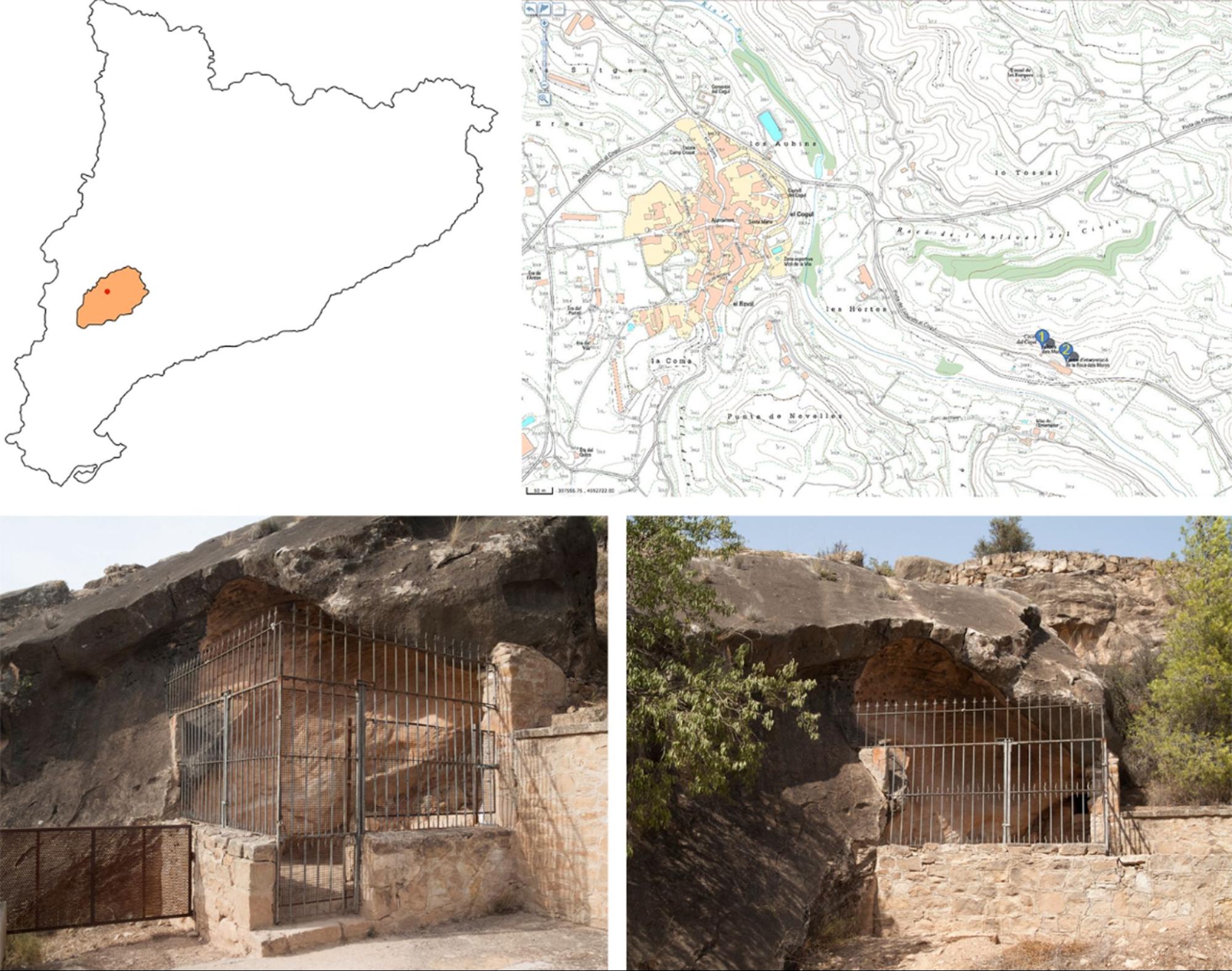 El conjunto rupestre de la Roca dels Moros se encuentra en un abrigo formado en la base de un bloque de roca arenisca, desprendido y asentado sobre la ladera suroeste del Tossal de les Forques, a 275 m sobre el nivel del mar, dentro del término municipal de El Cogul (comarca de les Garrigues, Lérida). El bloque en cuestión está situado junto a la carretera, entre El Cogul y L’Albagés, en la vertiente derecha del río Set, afluente del Segre (Figura 1).