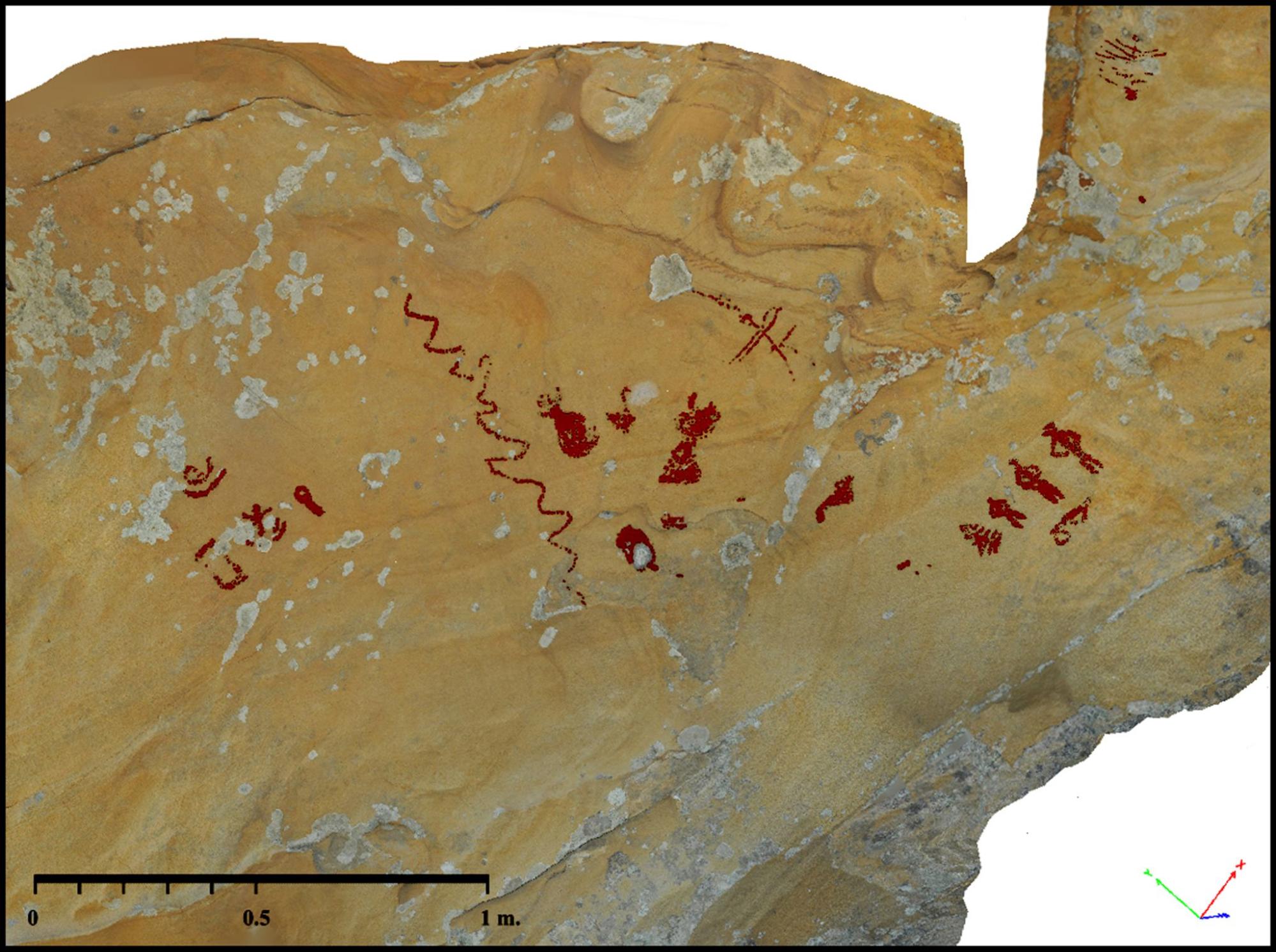 Ortofoto y calco superpuesto del panel I de la cueva de la Diosa I (Medina Sidonia, Cádiz). (Fuente propia).