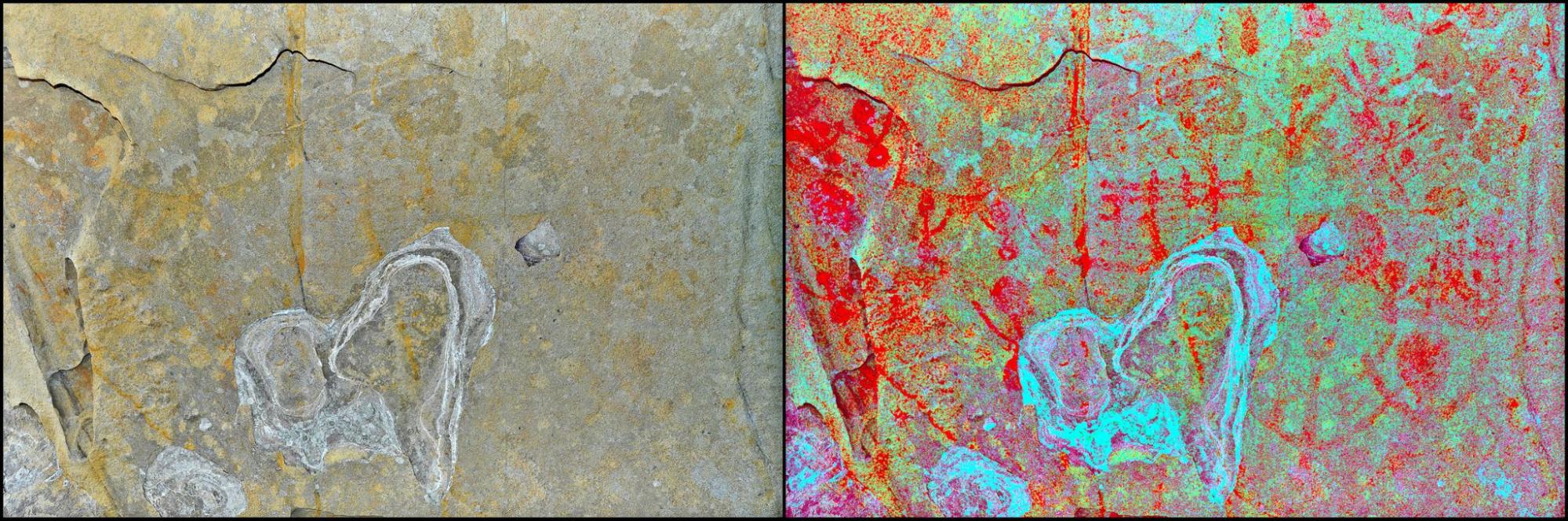 Ortofoto, imagen tratada y calco del panel principal de la cueva de Canuto Ciaque II (Medina Sidonia, Cádiz). (Fuente propia).