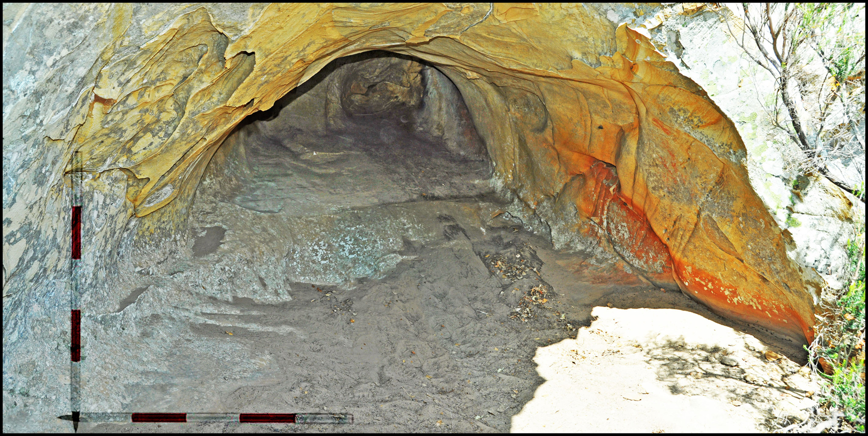 Se localiza a 20 m del enclave anterior en dirección oeste; es un recinto de planta irregular con superficie aproximada de 35 m2; sus dimensiones máximas son: 4,5 m de altura, 7 m de longitud y profundidad. La estación no dispone de plataforma adyacente exterior para la congregación de personas y el espacio interior aprovechable es de unos 20 m2. Posee dos entradas, la mayor orientada hacia el sureste con cotas de 5,50 m de largo y 1,5 m de altura máxima; la menor abre hacia el noreste y sus medidas son de 2,80 m de largo y 1,90 m de altura. La abrasión eólica debida a los vientos de levante afecta a las paredes del recinto, no obstante; la morfología de la cavidad proporciona zonas menos expuestas aptas para albergar pinturas. No detectamos daños antrópicos y, por los restos de excrementos de cérvidos observados, hay ocupación ocasional de fauna. El único lienzo pictórico que hemos documentado se ubica en una pared cóncava, entre las dos entradas; tiene 5 m de largo por 1,80 m de altura. Presenta colonización de líquenes, precipitación de soporte y erosión eólica en el vértice izquierdo (Figura 9). Se dibujaron dos unidades de contenido ubicadas en el centro y zona derecha de la pared rocosa.