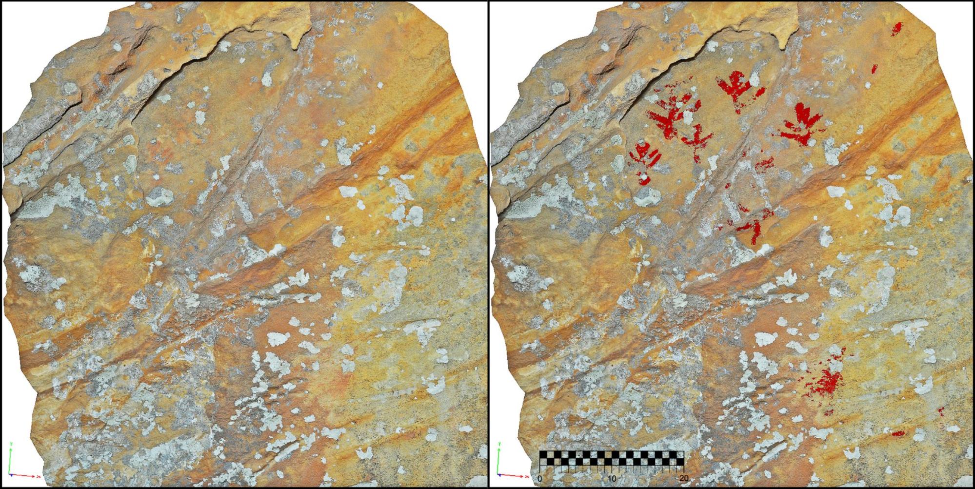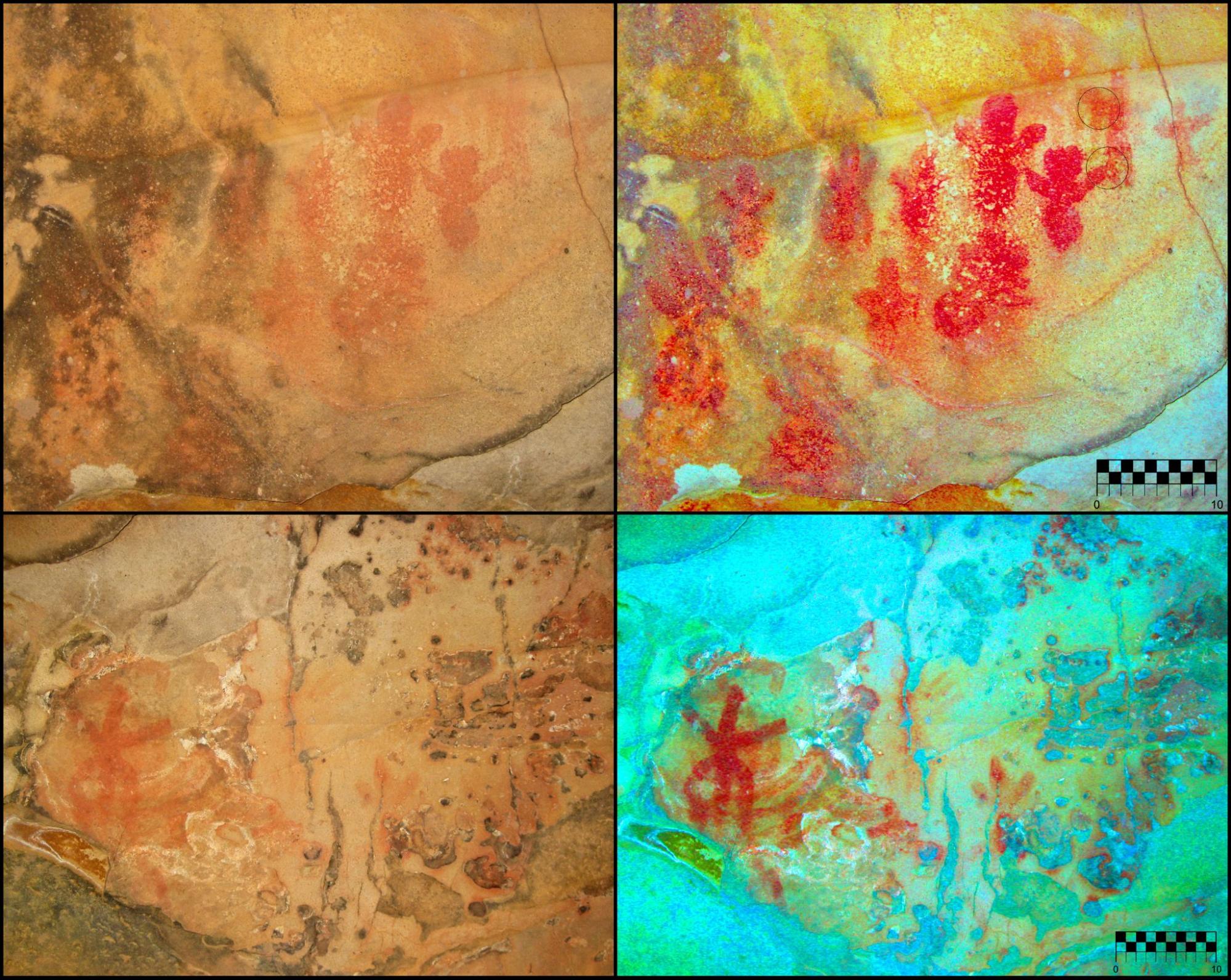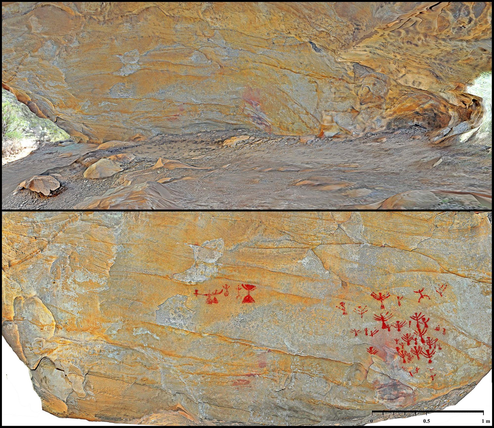 Las figuras se concentran en la zona de máxima profundidad, lateral izquierdo, ocupando 1,5 m2 de pared. En la parte central de la oquedad existen descamaciones naturales en las que no detectamos restos de pintura. En el apartado de deterioro por daños antrópicos no hay que lamentar pérdida patrimonial, no se evidencian huellas de visitas incontroladas ni de actividades asociadas a la explotación de estas sierras (carboneros, corcheros, pastores…), es un espacio poco frecuentado y de escaso provecho para estos colectivos. Respecto al panel pictórico, la mayoría de las figuras están completas, contrastan poco con la superficie rocosa y se constata abrasión eólica en la zona superior del lienzo. A lo que hay que añadir un soporte oscurecido, por contener una alta concentración de minerales de cementación, que limita aún más su visualización. Breuil y Burkitt solo pudieron documentar 16 manifestaciones, desde entonces no ha habido nuevos estudios y actualización de registros[15]. Nuestra exploración digital nos ha revelado una serie de puntos y motivos figurativos. Estos últimos son de adscripción iconográfica al A.R.E. e identificables con antropomorfos, aunque reflejan distintas variantes gráficas para su representación. En la parte superior del panel distinguimos sesenta digitaciones y veintiuna figuras: catorce son clasificables como bitriangulares antropomorfos, tres poseen cabeza triangular y cuerpo de trazo simple, una tiene cuerpo triangular y cabeza circular. En la parte inferior solo encontramos seis motivos, cinco de cuerpo ovalado o globular y uno de trazo simple conservado parcialmente. Estamos ante dos grupos de motivos independientes que presentan diferencias en ubicación, diseño y tonalidad, cuestiones que nos advierten de, al menos, dos momentos de ejecución.