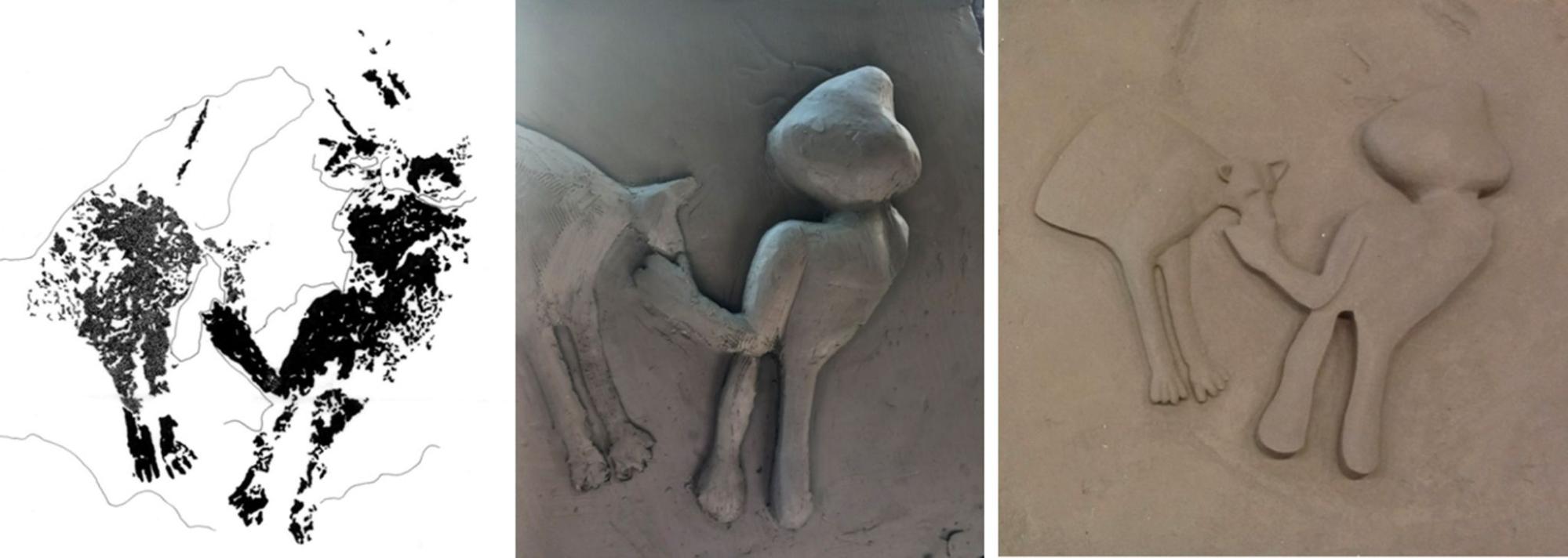 Un segundo estudio puso el foco en las pinturas rupestres de Moratalla. Del conjunto de La Risca, centramos nuestro interés en las dos figuras femeninas más representativas del arte rupestre levantino. Por su lado, de Cañaica del Calar II nos detenemos en la escena de la mujer y el oso, cuyo simbolismo no deja de sorprendernos (Figura 1). Escenas representadas en la roca que nos inspiran en la creación de interpretaciones en el ámbito de la escultura contemporánea.