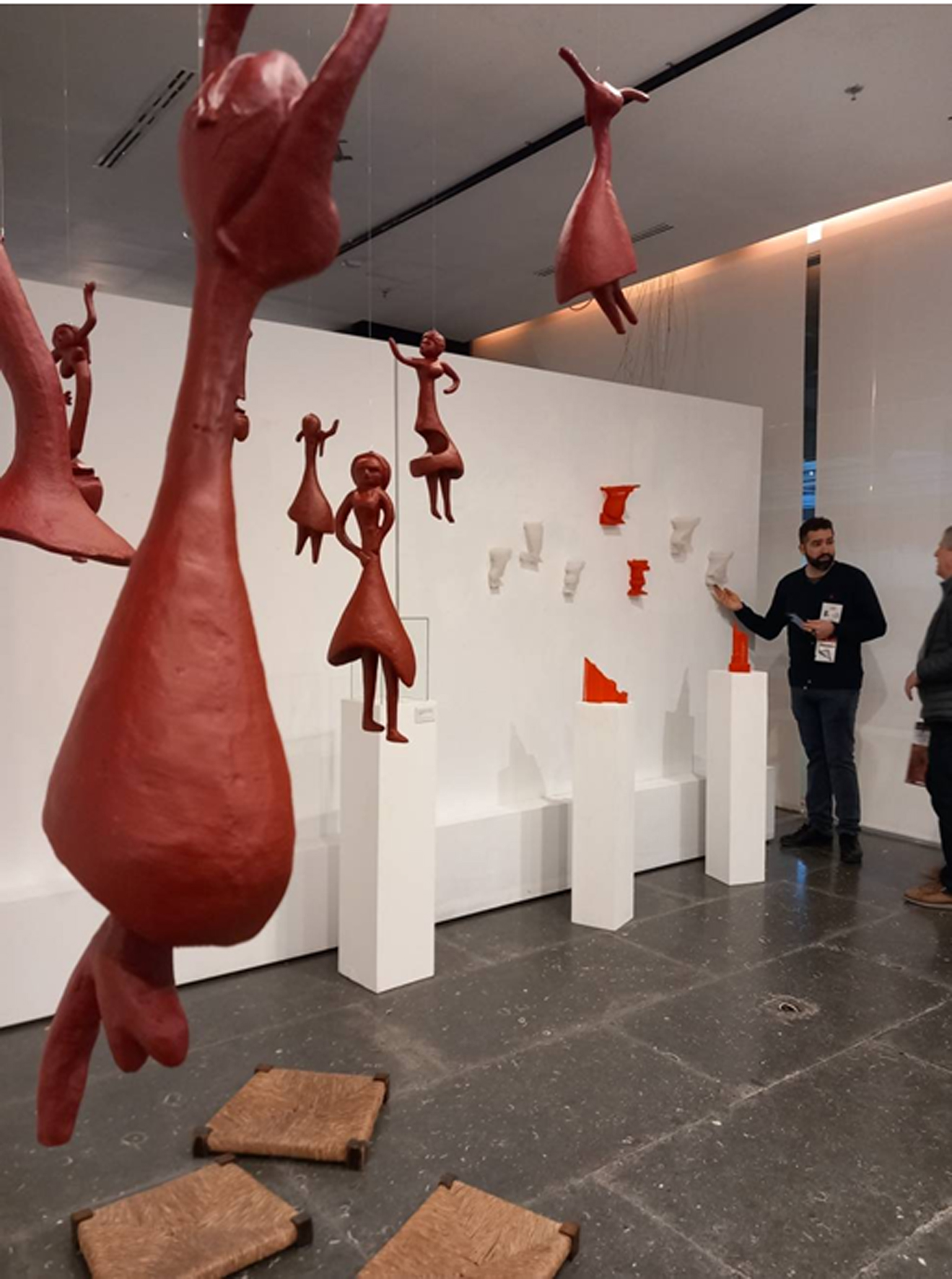 Dentro del análisis de difusión de resultados, esta participación colectiva en Sevilla contribuye de nuevo a un impacto del proyecto fuera del territorio regional, ampliando su proyección en un contexto más amplio. En esta muestra el artista presenta dos instalaciones y la obra La zagaliza del esparto reproducida seriada tras las primeras pruebas en impresión 3D (Figura 13).