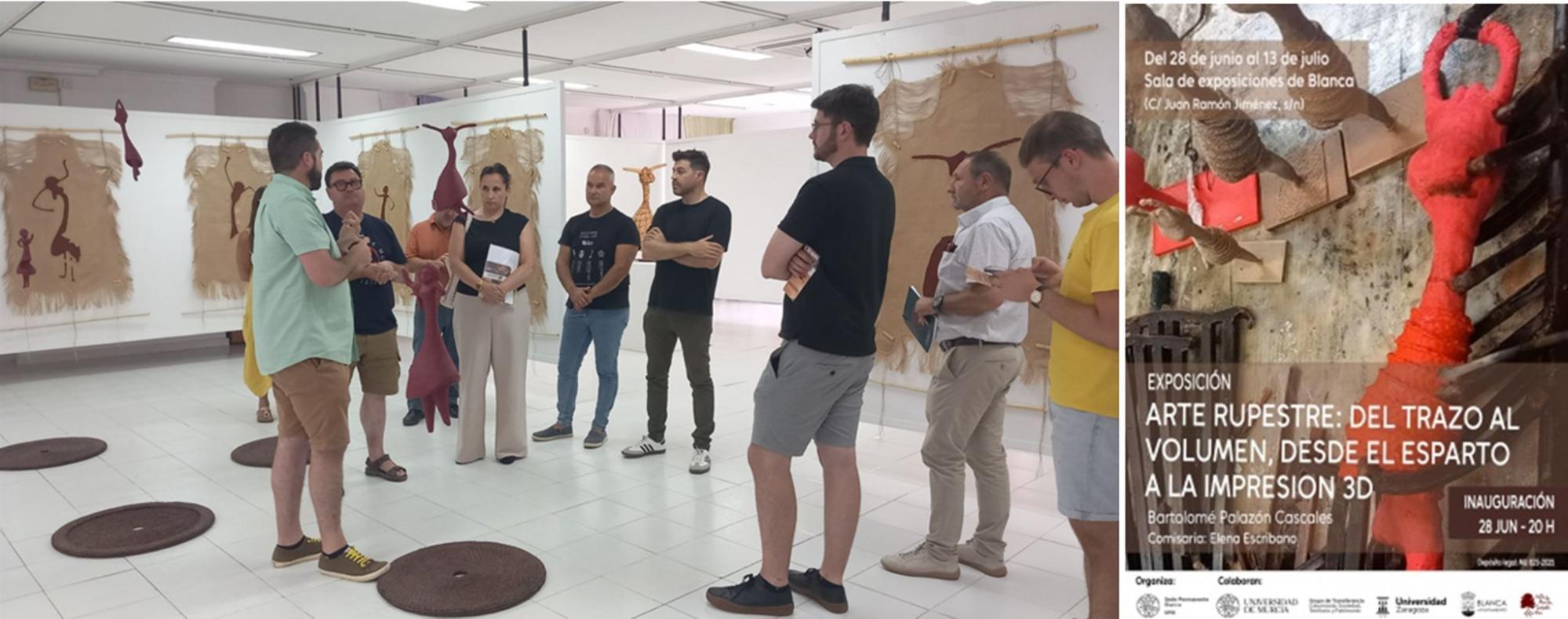 Visita guiada a la exposición “Arte rupestre: del trazo al volumen, desde el esparto a la impresión 3D” celebrada en Blanca y cartel de la muestra. Fotografía de A. M. Gambín Soriano.