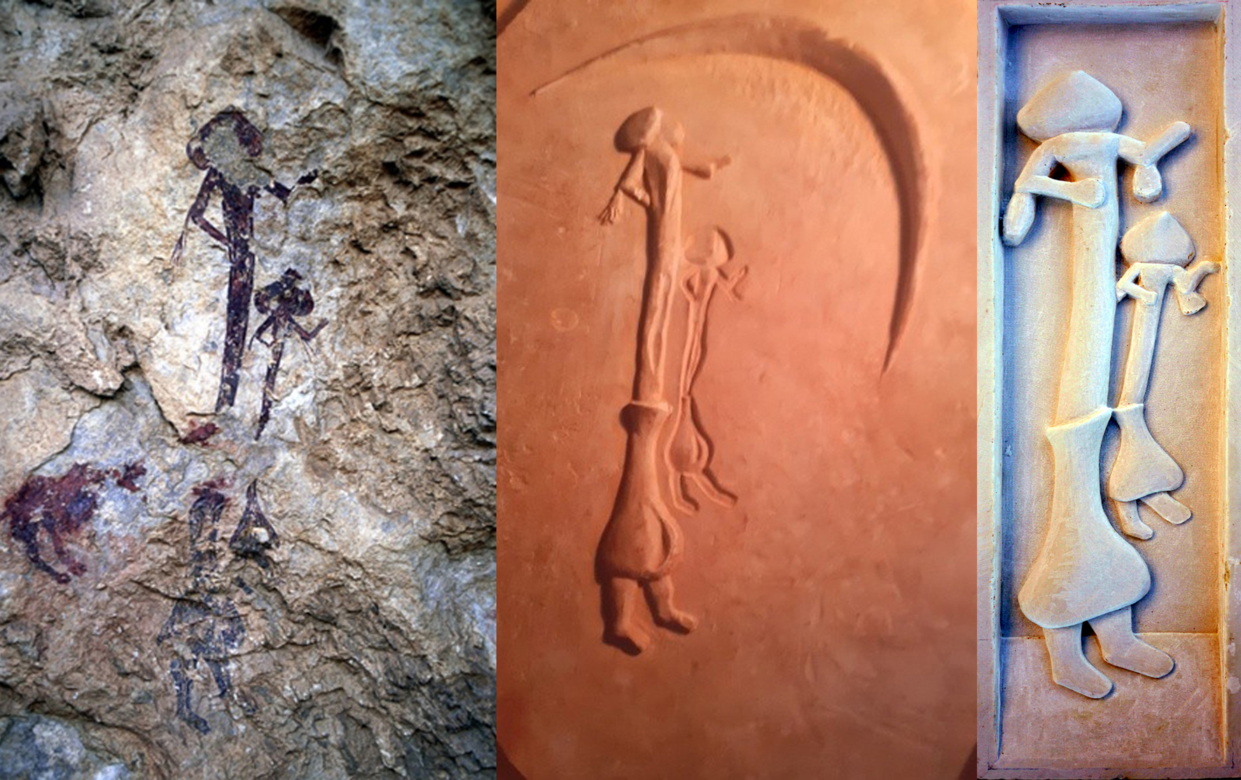 Izquierda: figuras de La Risca I de Moratalla. Fotografía de M. Á. Mateo Saura. Centro: bajo relieve positivado en silicona realizado por B. Palazón Cascales en la Universidad de Murcia, 2006. Derecha: alto relieve en mármol blanco estatuario realizado por B. Palazón Cascales en la Accademia di Belli Arti di Carrara, 2023.