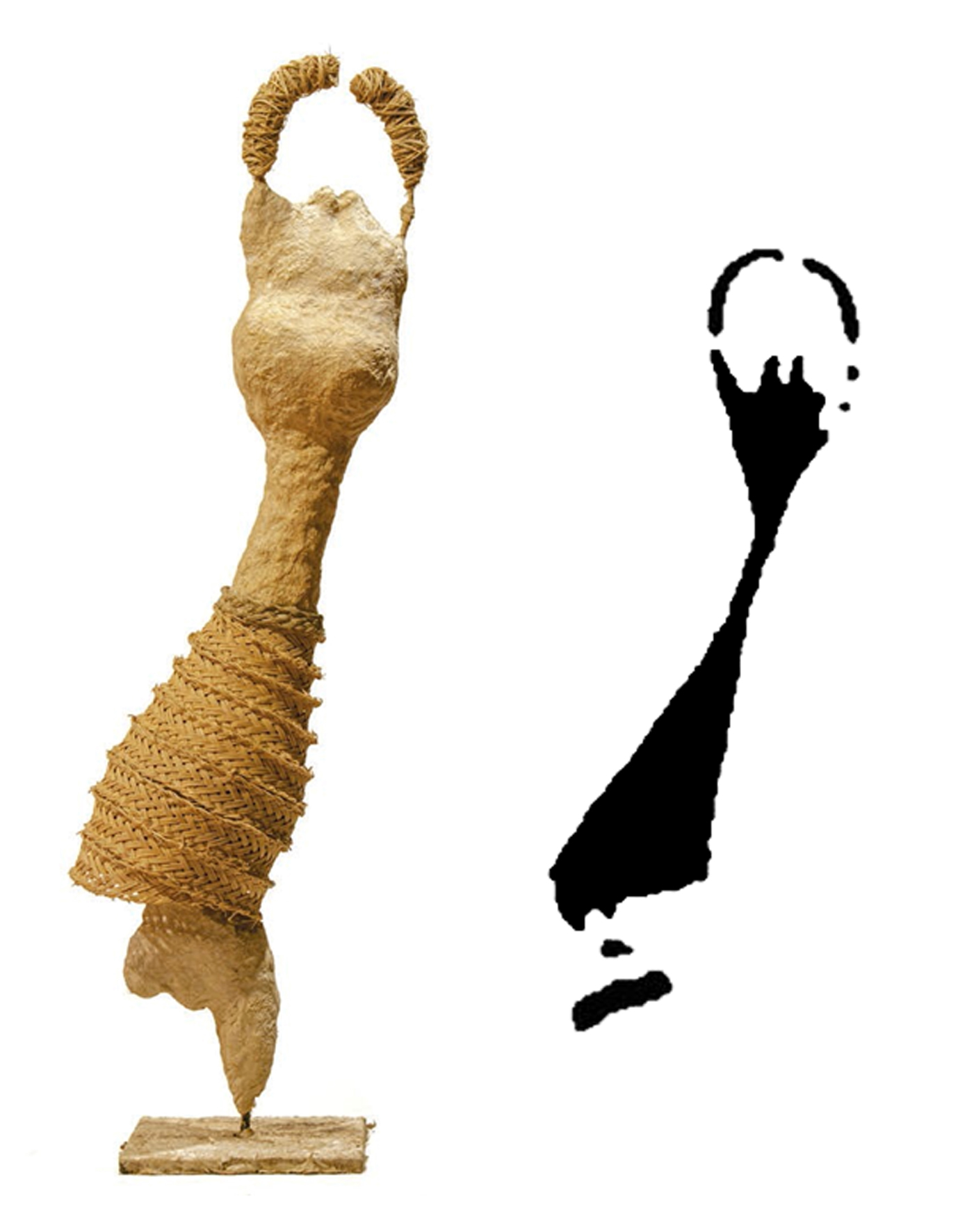 Izquierda: La zagalica del esparto. 90 x 30 x 30 cm. Fibras y celulosa de esparto, de B. Palazón Cascales. Derecha: figura seleccionada del calco del Barranco de los Grajos I, según A. Beltrán Martínez.