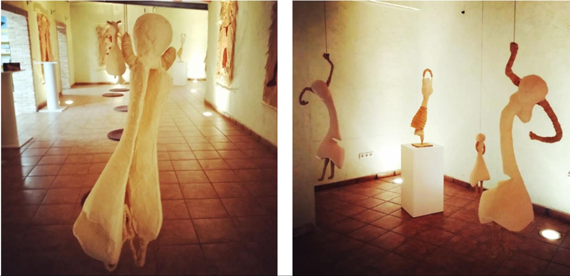 En este segundo proyecto se muestra las posibilidades creativas del esparto a través de diversas técnicas expresivas del arte. En este caso, las esculturas realizadas con fibra y celulosa de esparto están pensadas para ser suspendidas en el aire, y una vez expuestas de esta forma, generan un espíritu narrativo de la escena que representan. Estas obras presentan unas medidas que oscilan aproximadamente entre 40 y 55 cm de alto, entre 13 y 19 cm de ancho y entre 12 y 18 cm de profundidad. Sus títulos siguen la misma línea que el proyecto anterior, con lo cual el conjunto de esculturas lo conforman El verano II, La primavera II, El otoño II y El invierno II, en relación a las estaciones del año; Fuego II, Tierra II, Agua II y Aire II, como los cuatro elementos de la naturaleza; y Tótem II. Las figuras femeninas se presentan estilizadas, con el movimiento y dinamismo característico del arte levantino. La expresión artística que confiere la interpretación de este conjunto de figuras se presenta mostrando claramente intereses estéticos. Se lleva a cabo un proceso de esquematización y simplificación de los volúmenes, ejecutados de forma intencionada en las esculturas que confieren al conjunto una mayor espiritualidad y misticismo (Figura 6).