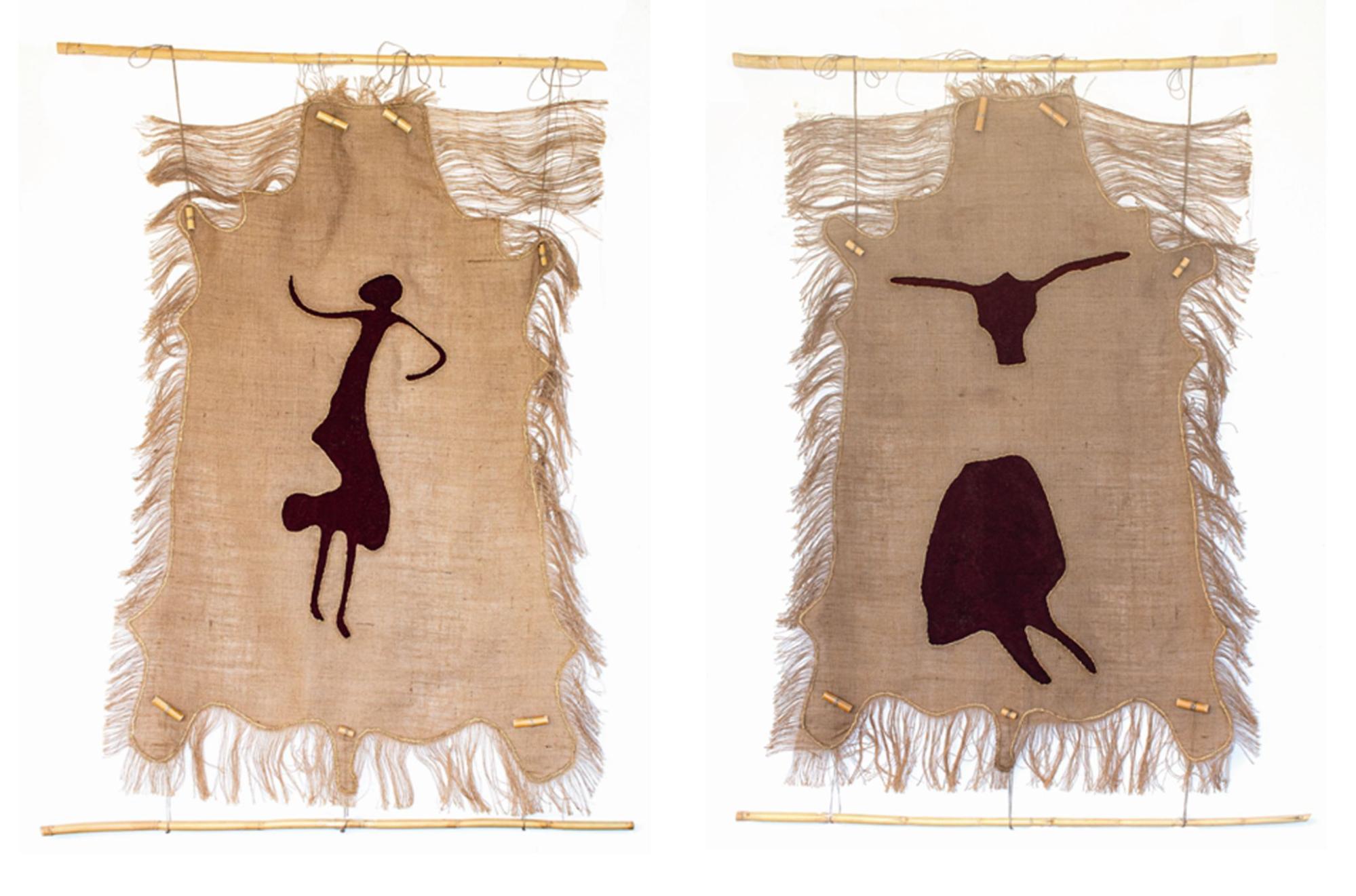 Si bien, la parte más importante de este primer proyecto es la interpretación escultórica de esta figura destacada, se desarrolla también a un tamaño mayor la escenificación del panel completo del abrigo de Los Grajos. Se procede a representar cada una de las figuras que componen dicho panel sobre arpillera (yute) en forma de piel de animal. Para llevar a cabo la impresión fiel de las siluetas del conjunto, se empleó tecnología láser desarrollada en espacios de experimentación digital “Fab Labs” del Instituto Europeo di Disegn de Madrid. Muchas de las figuras no disponen de todos sus atributos, por lo que se lleva a cabo una interpretación de cómo serían dichas formas. Se emplea para dar color a las obras pigmento natural rojo (almagra), al igual que pudieron emplear en las pinturas rupestres. El resultado son nueve obras cuyos nombres están relacionados con las estaciones del año y los cuatro elementos de la naturaleza: El verano, La primavera, El otoño y El invierno, y Fuego, Tierra, Agua y Aire. Además de la única obra que representa el Tótem. Presentan unas dimensiones de 150 x 100 x 2 cm, y las líneas que bordean las siluetas femeninas están reforzadas a modo de costuras con esparto, generando así unos hueco-relieves que cubren las paredes simbolizando el abrigo rupestre (Figura 5).