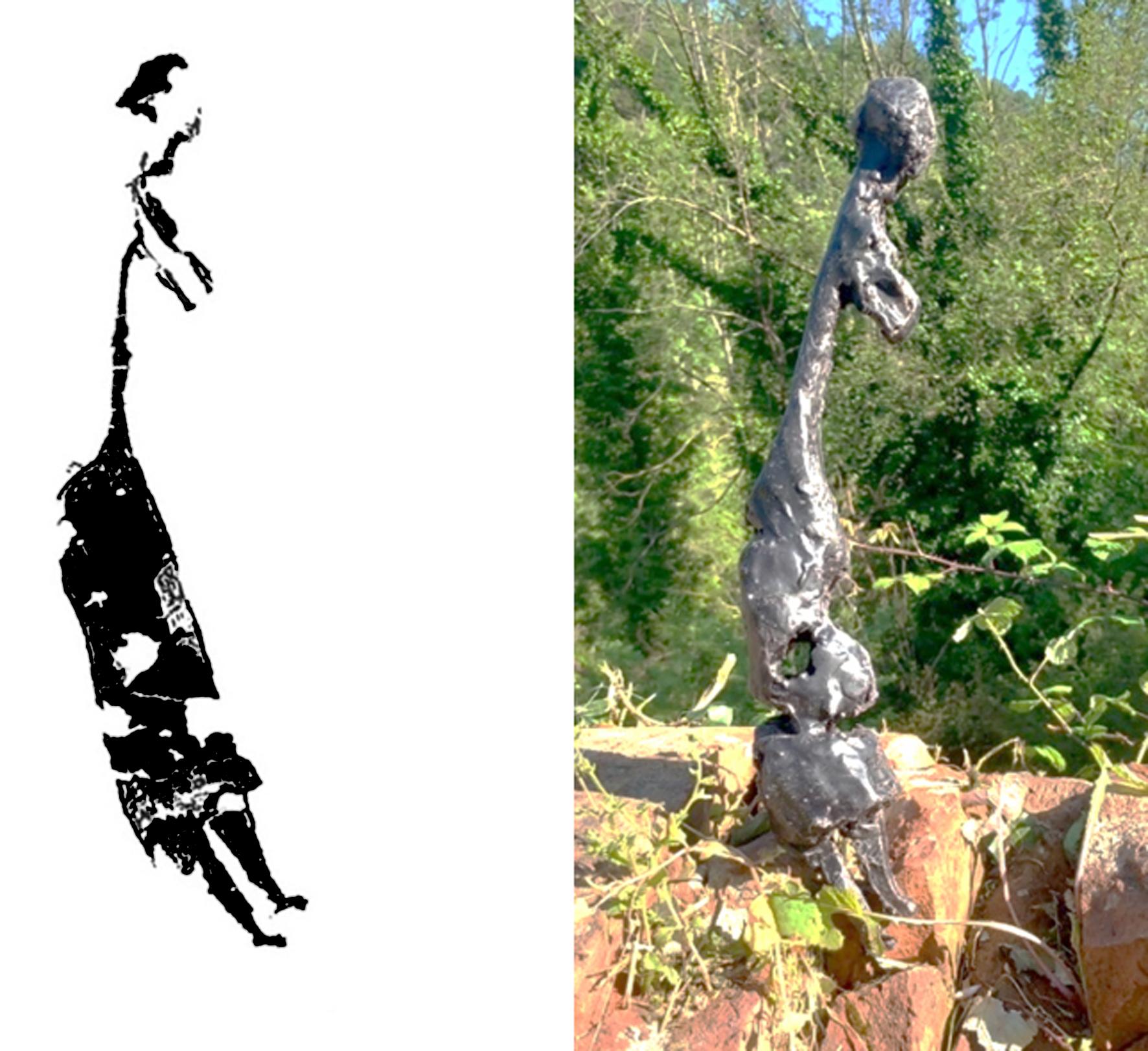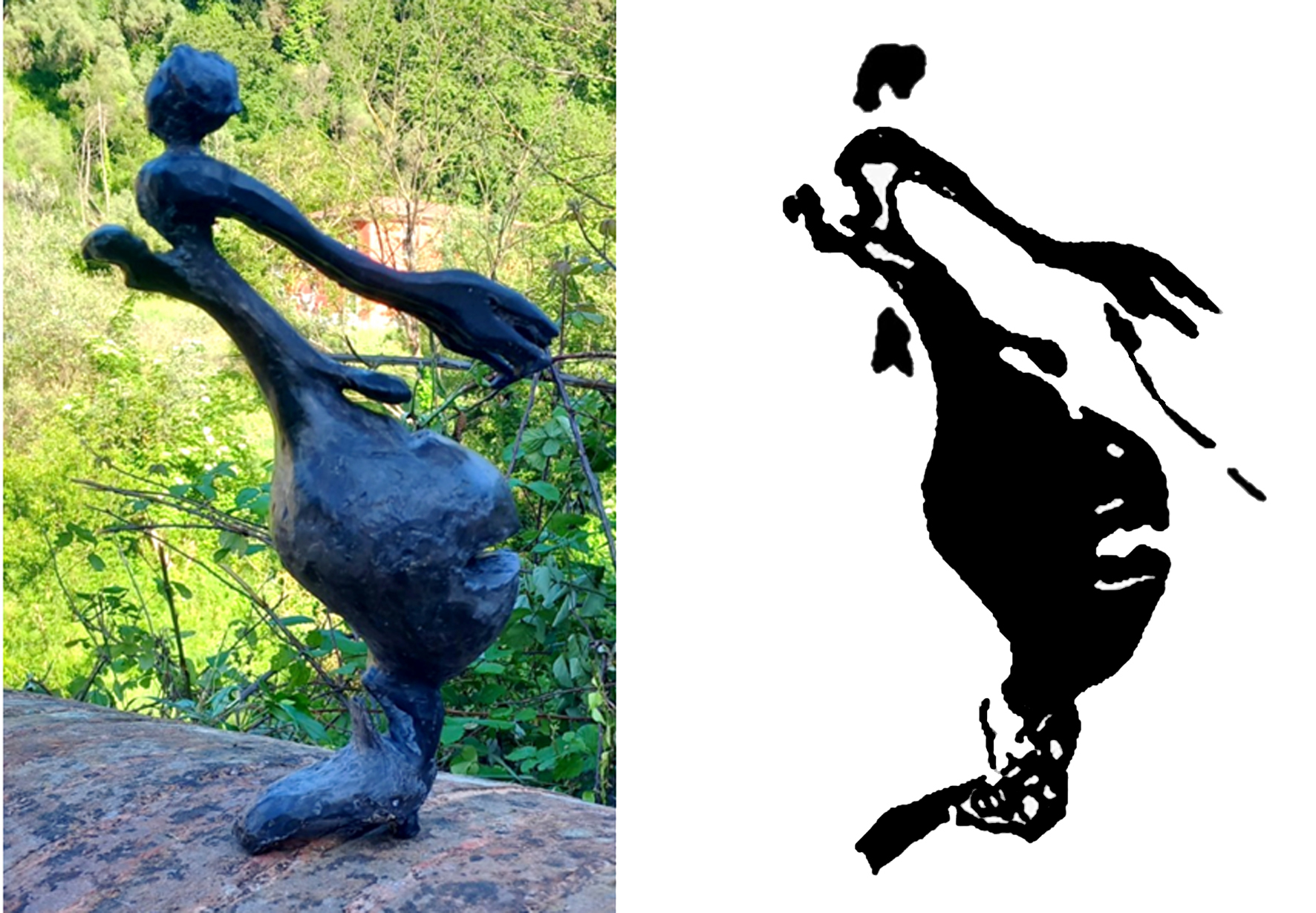 Izquierda: calco de la figura femenina de Val del Charco del Agua Amarga (Alcañiz), según A. Beltrán y J. Royo. Derecha: interpretación escultórica en cera, de B. Palazón Cascales, en la Accademia di Belle Arti di Carrara.